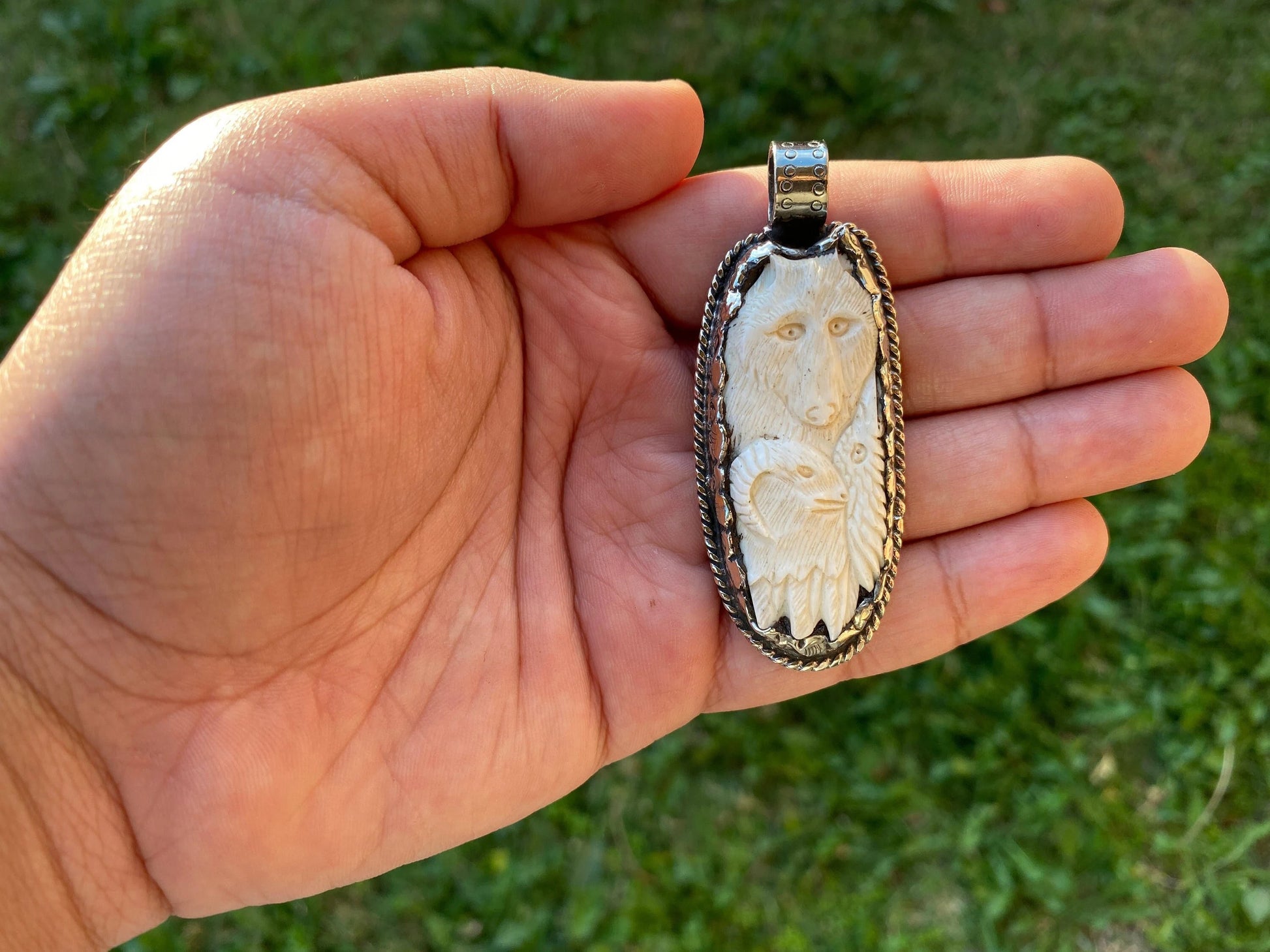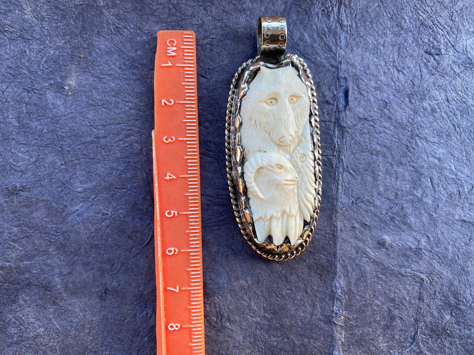 Water Buffalo Bone Pendant, Hand Carved Eagle, Bear & Sheep, Made with Tibetan Silver, Himalayan, Tribal, Ethnic, Flower Designs, Handmade Repousse Silver Pendant