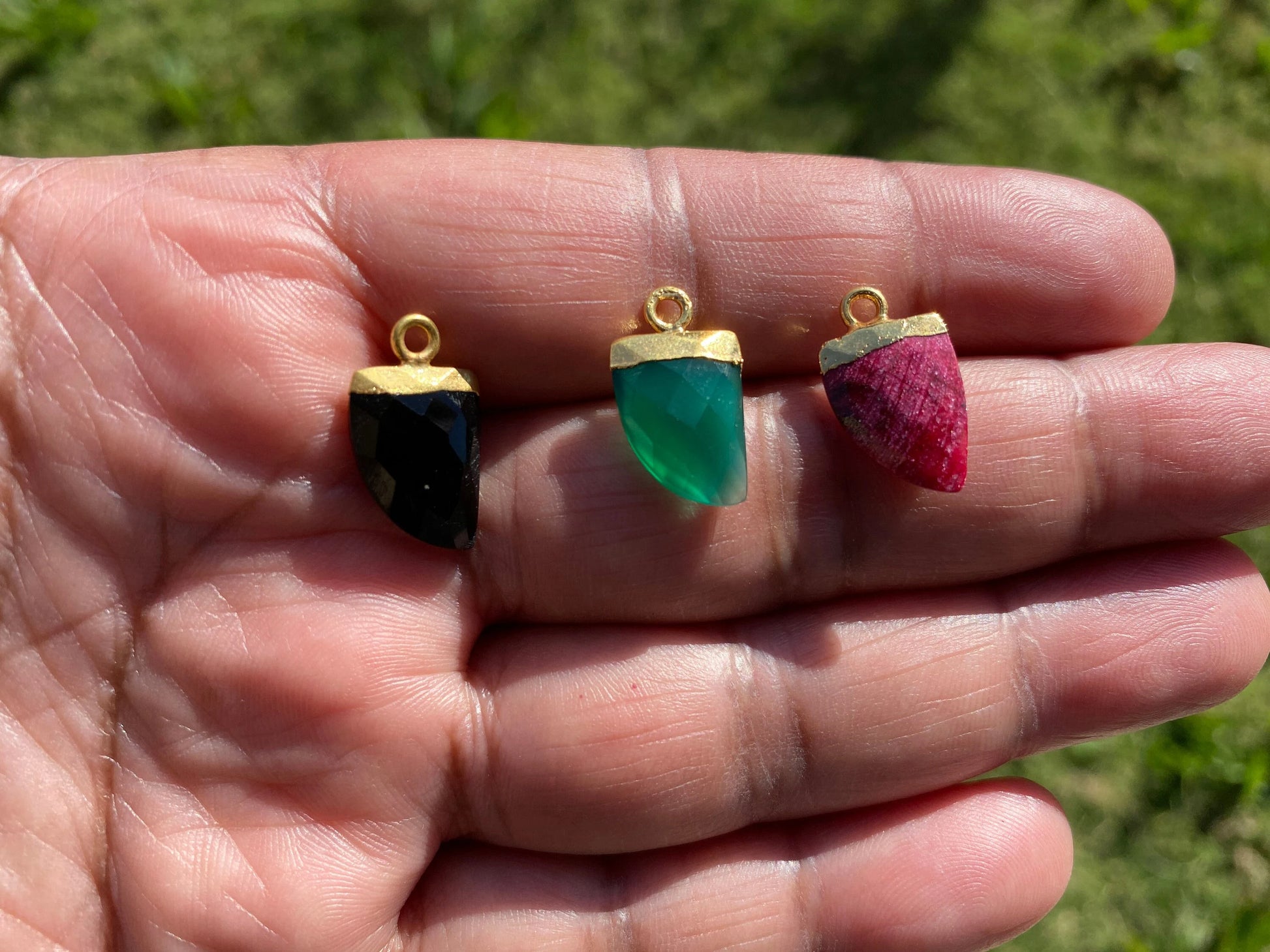 These beautiful high quality 18K Gold Electroplated . Made with sterling silver bail and faceted Black Onyx, Green Onyx & Dyed Ruby Gemstones. These charms are sure to make an impact on your jewelry project. These beads would be a great addition to your necklace, bracelet or earring project. These beads would look great strung on beaded necklace, Dainty Chain necklace or even for Earrings.Please note: you will receive a random pieces.