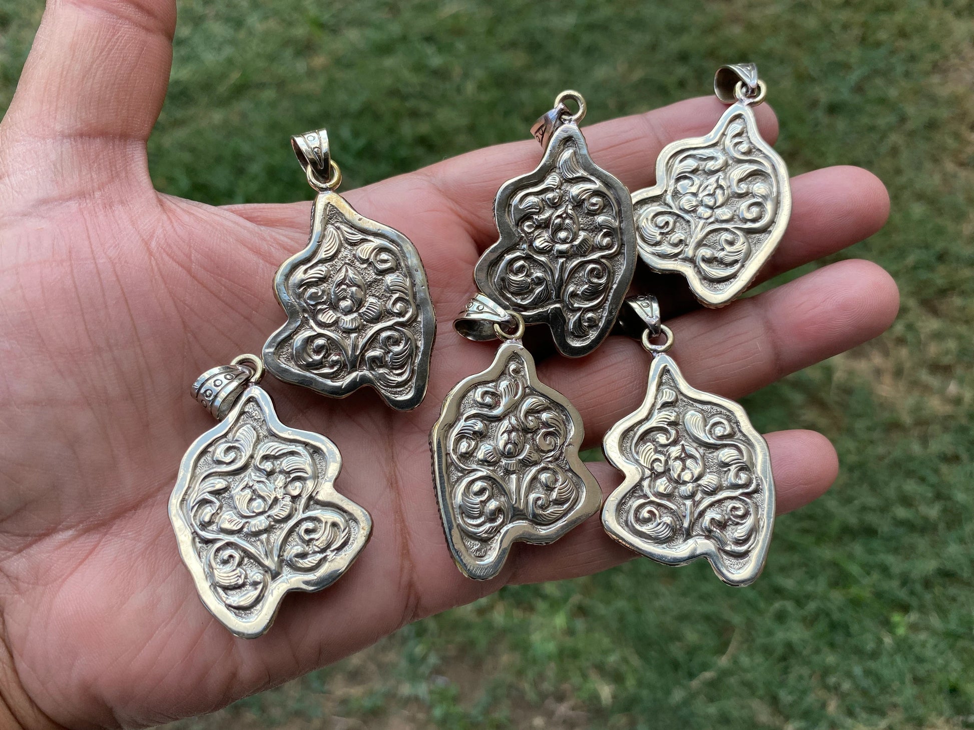 Made with Tibetan Silver with Natural Carved Labradorite stone. Beautiful hand carved on the back. These are sure to make an impact on your jewelry project. This pendant would be a great addition to your necklace, would look great strung on beaded Necklace, Chain or Mala.Beauty and magic of this pendant that is unmatched as they are handmade and are one of a kind. With the nature of them being handmade, each product is unique in its own right and no two products are the exact same. Large BailMeasurement: approximately Length 45 mm (measuring from bail to bottom), width 28 mm from the widest side, bail size: 8 mm and weighs about 17.30 gm.DD: 0350Disclaimer: Items are handmade so please note: Each item is unique may have some small imperfections. There can be a slight difference in actual color than shown in picture.Images may appear enlarged or smaller. Please refer to the measurements given. ✤ Keep in mind:1. Product VarianceAs the jewelry is handmade in nature, the items may experience variance in texture, shape, color, and finish. This also comes with some imperfections, which sets them apart from jewelry made in a factory – that being said please read the description thoroughly and view the pictures before you make your final purchase. As always, please don’t hesitate to ask us if you have any questions as we are more than happy to provide you with utmost quality assurance.