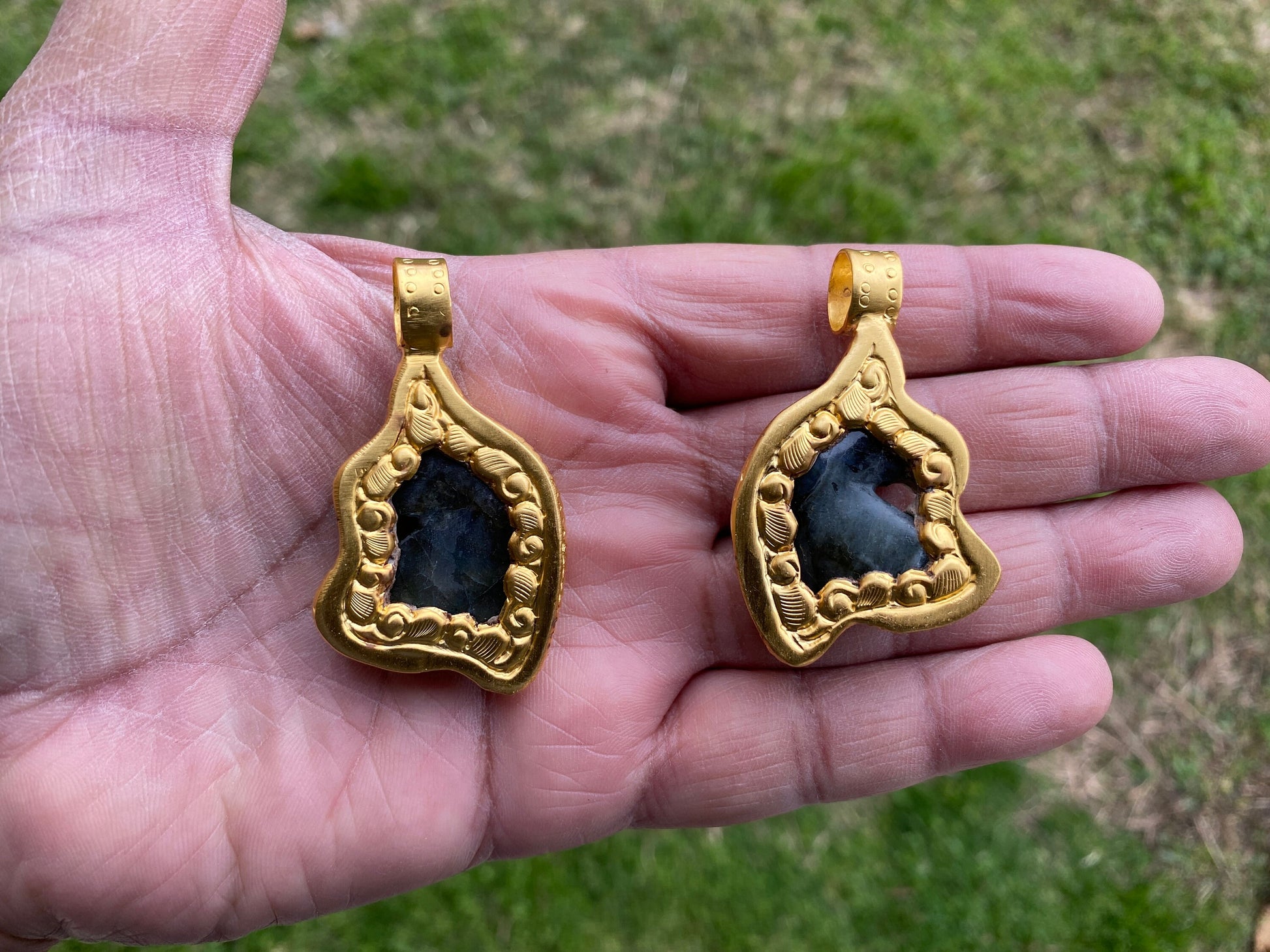 Made with 18K Brushed Gold Overlay Over Brass with Natural Carved Labradorite stone. Beautiful hand carved on the back. These are sure to make an impact on your jewelry project. This pendant would be a great addition to your necklace, would look great strung on beaded Necklace, Chain or Mala.Beauty and magic of this pendant that is unmatched as they are handmade and are one of a kind. With the nature of them being handmade, each product is unique in its own right and no two products are the exact same. Large BailMeasurement: approximately Length 45 mm (measuring from bail to bottom), width 28 mm from the widest side, bail size: 8 mm and weighs about 17.30 gm.DD: 0350Disclaimer: Items are handmade so please note: Each item is unique may have some small imperfections. There can be a slight difference in actual color than shown in picture.Images may appear enlarged or smaller. Please refer to the measurements given. ✤ Keep in mind:1. Product VarianceAs the jewelry is handmade in nature, the items may experience variance in texture, shape, color, and finish. This also comes with some imperfections, which sets them apart from jewelry made in a factory – that being said please read the description thoroughly and view the pictures before you make your final purchase. As always, please don’t hesitate to ask us if you have any questions as we are more than happy to provide you with utmost quality assurance.