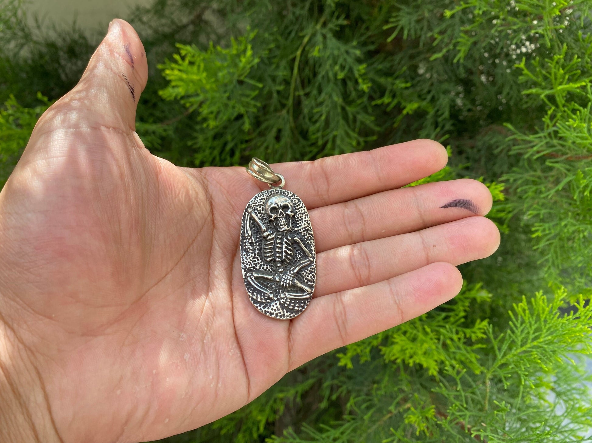The "Soul Sentinel" pendant features a intricately carved skull in Tibetan silver, symbolizing wisdom and protection. Enhanced by detailed Tibetan silver settings and motifs, this amulet serves as a guardian against negative energies. Beyond adornment, it offers wearers a profound connection to the divine and the eternal cycle of life and death, blending mystique with elegance.This listing is for 1 piece.