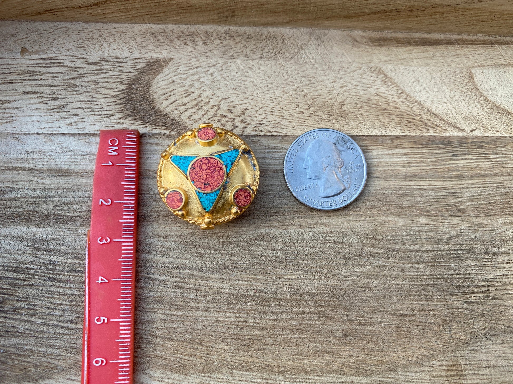 Tibetan Beads, High Quality 18k Matte Gold Overlay Over Brass, Turquoise with Coral Inlay, Handmade Bead, Beads for Necklace, Guru Mala Bead