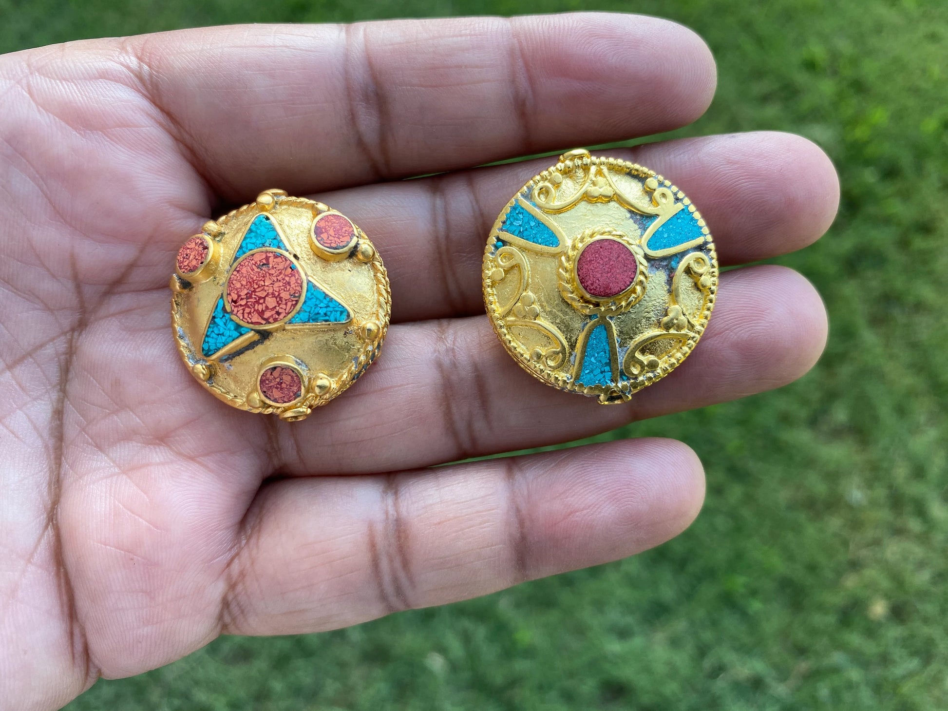 These beautiful high quality 18K Matte Gold Overlay over brass with anti-tarnish finish so that It will not tarnish. These Tibetan beads were handcrafted in Nepal. Hand-carved beads made with Turquoise with Coral inlay, both-side same designs. These Beads are sure to make an impact on your jewelry project. These beads would be a great addition to your necklace or bracelet project. These beads would look great strung on beaded necklace or Mala.