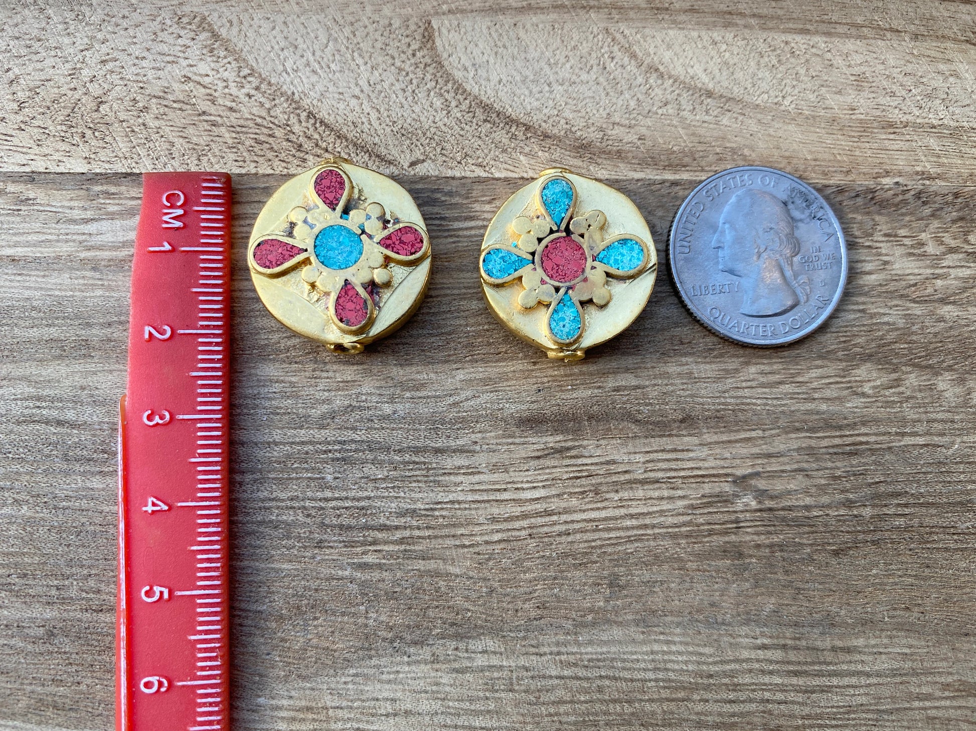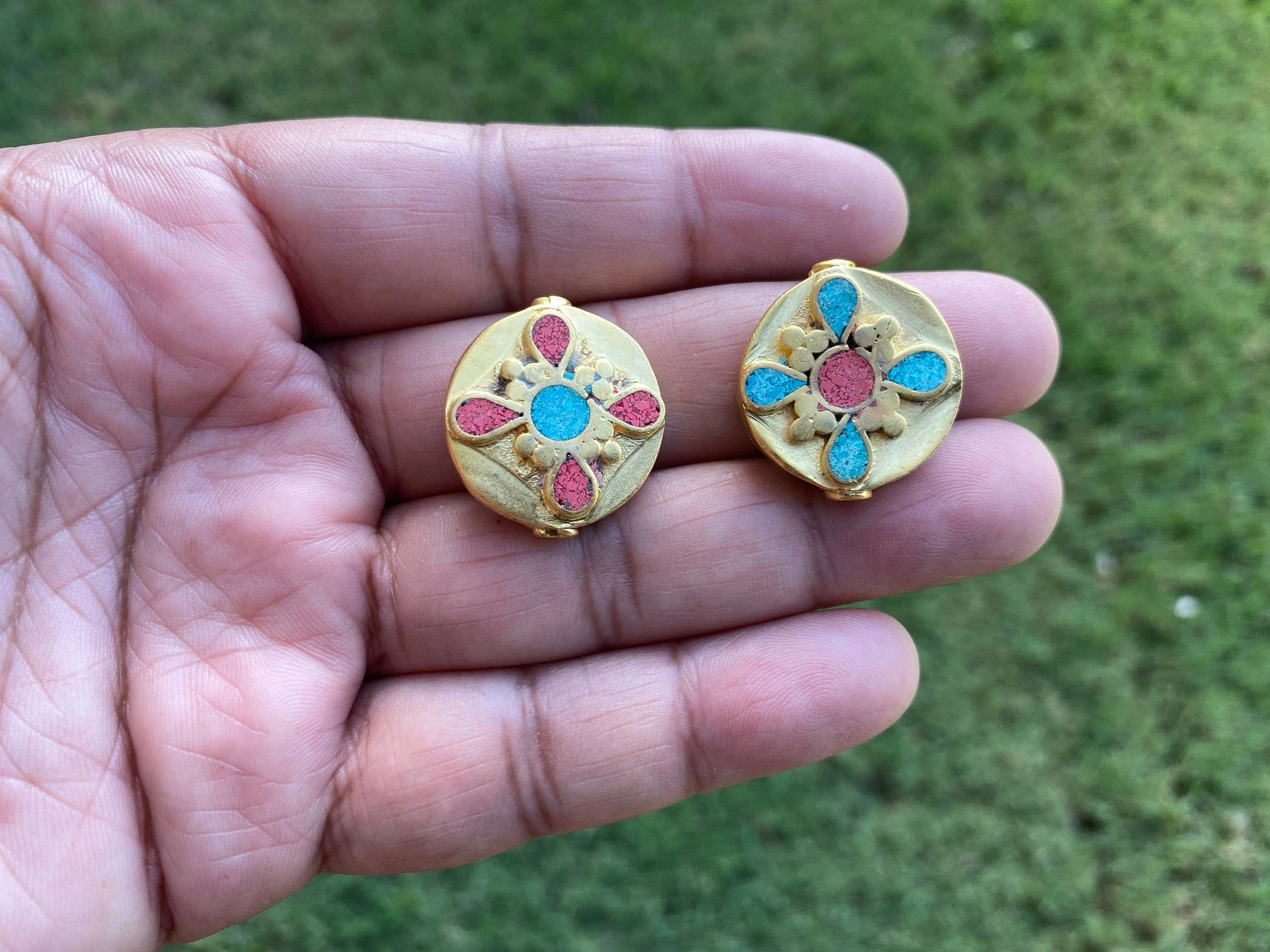 This listing is for 1 piece. These beautiful high quality 18K Matte Gold Overlay over brass with anti-tarnish finish so that It will not tarnish. These Tibetan beads were handcrafted in Nepal. Hand-carved beads made with Turquoise with Coral inlay, both-side same designs. These Beads...