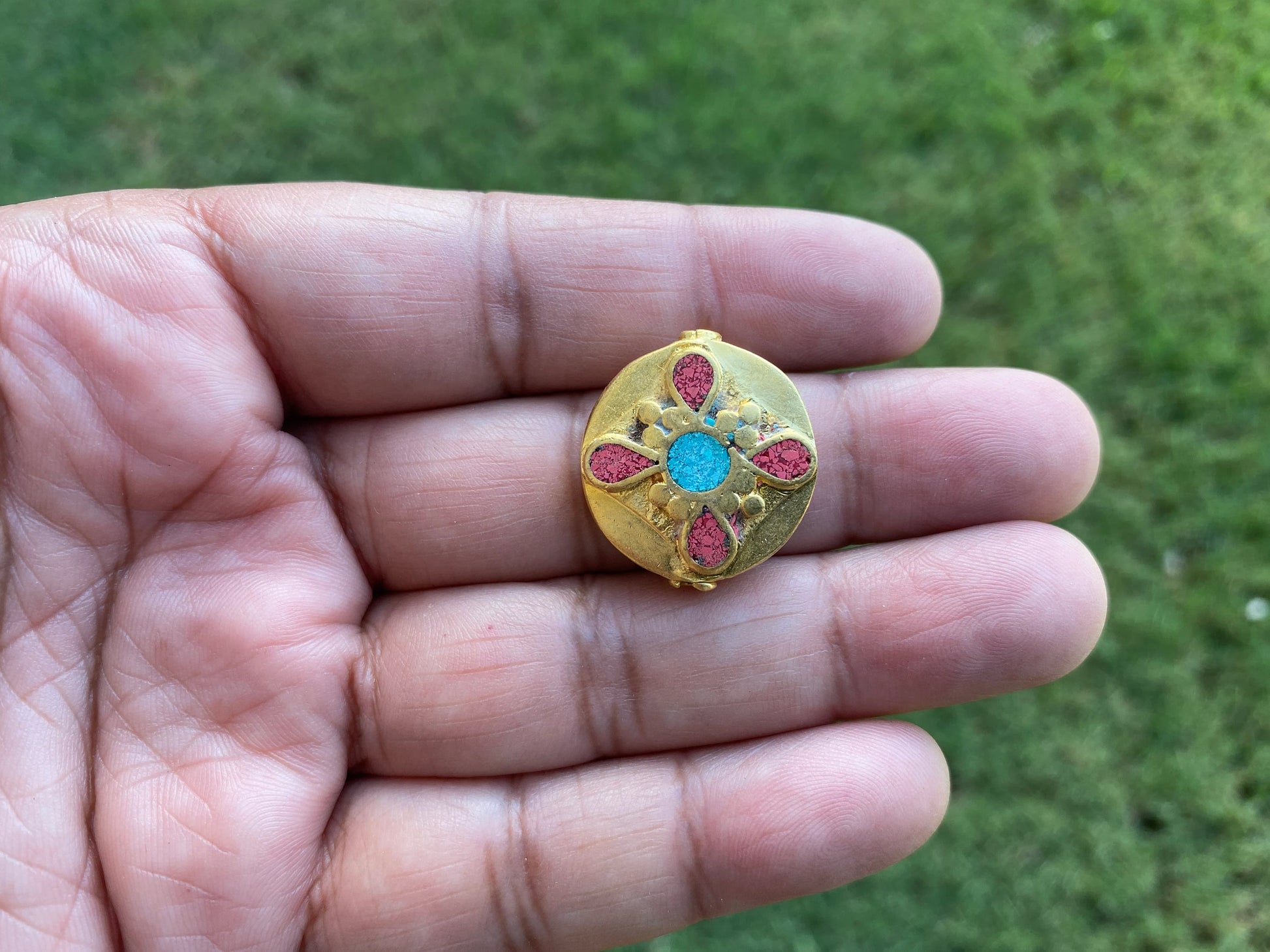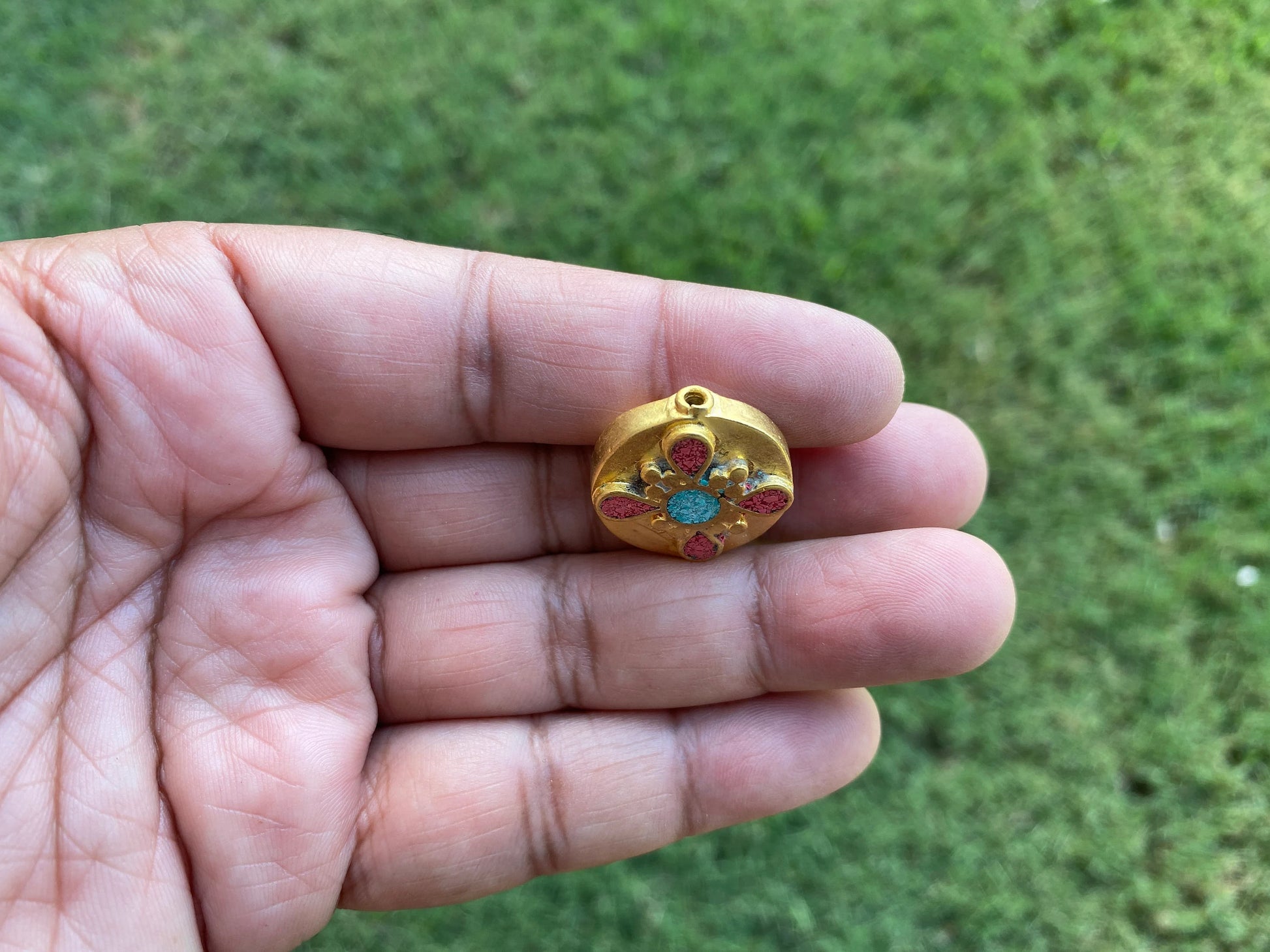 These beautiful high quality 18K Matte Gold Overlay over brass with anti-tarnish finish so that It will not tarnish. These Tibetan beads were handcrafted in Nepal. Hand-carved beads made with Turquoise with Coral inlay, both-side same designs. These Beads are sure to make an impact on your jewelry project. These beads would be a great addition to your necklace or bracelet project. These beads would look great strung on beaded necklace or Mala.
