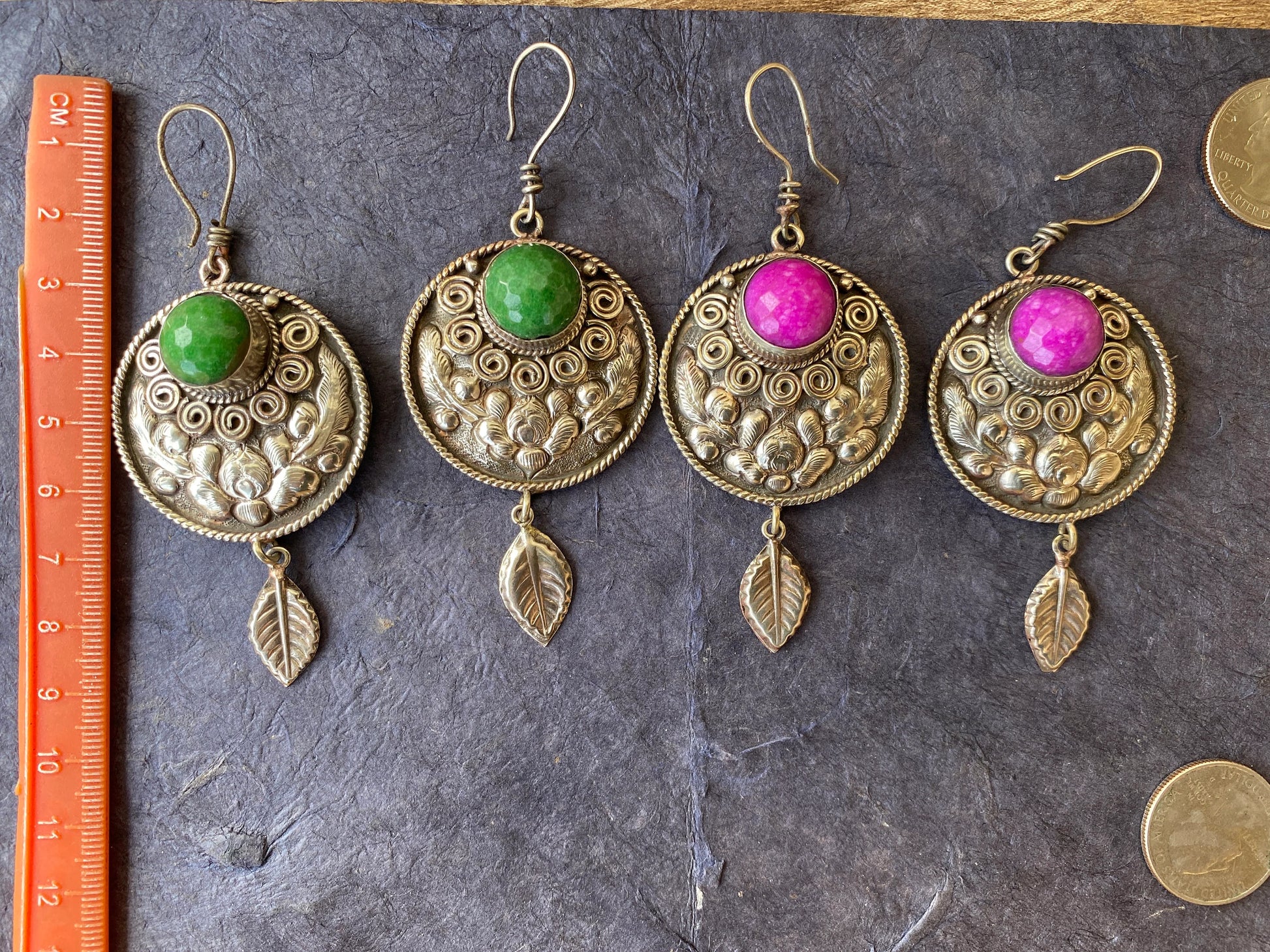Tibetan Designs Earrings, Made with Tibetan Silver & Green Agate or Purple Agate Stone, Tribal Earrings, Bohemian Earrings, Gift for Wife