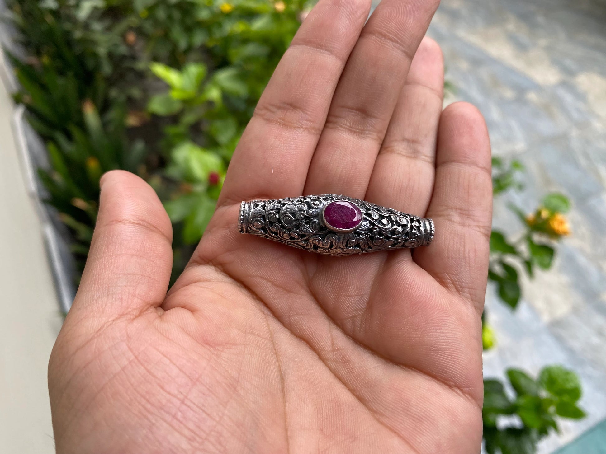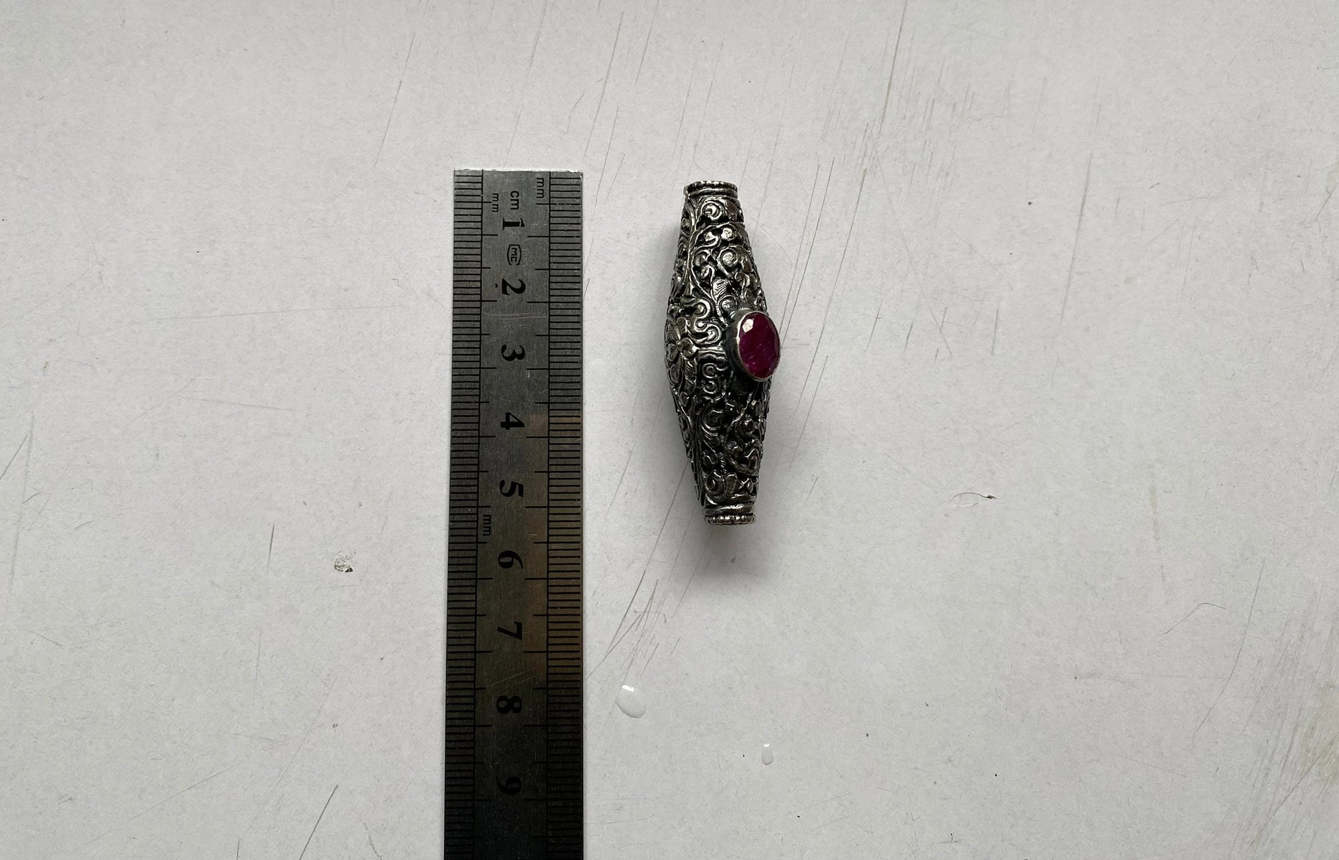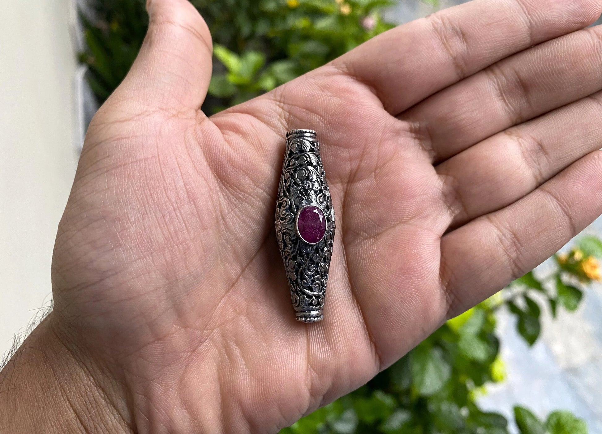 Handcrafted in Nepal, these Tibetan beads are made of copper, with intricate carvings and inlaid with emerald. Very special additions for any necklace or bracelet projects. These artisan beads will make a striking impact strung on beaded necklaces or chains. Perfect for any kind of jewelry design.