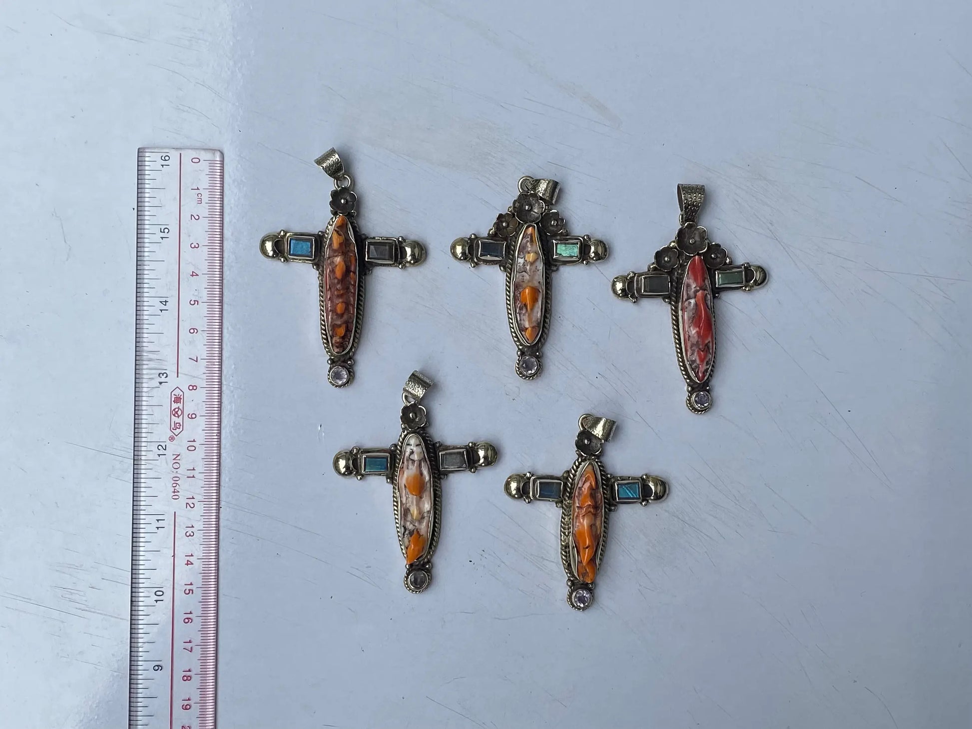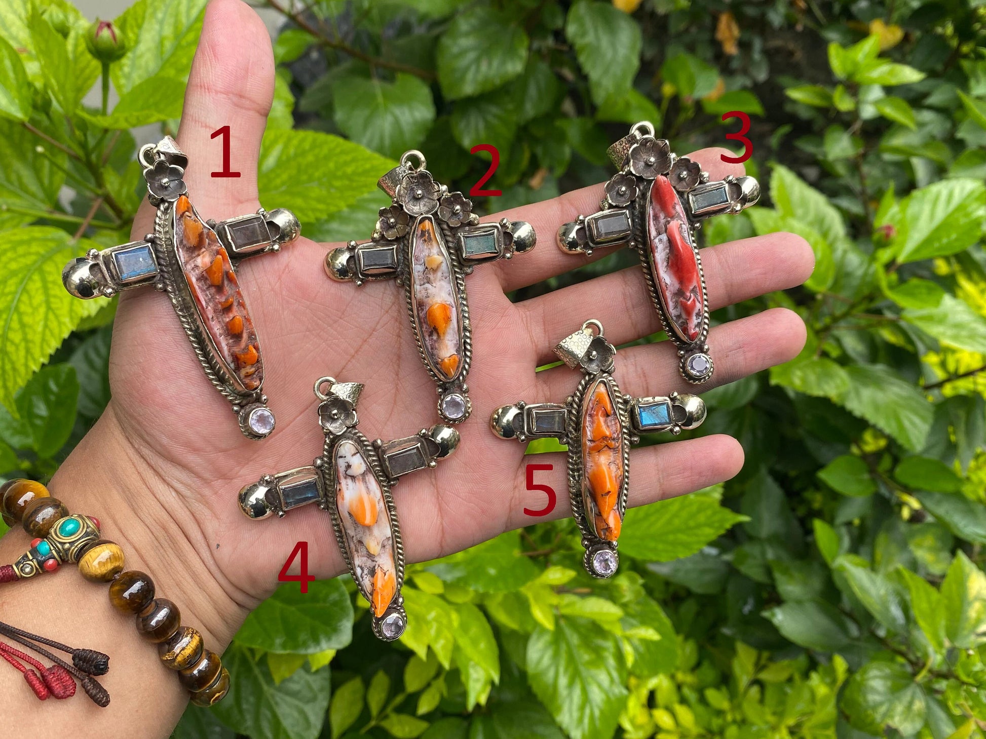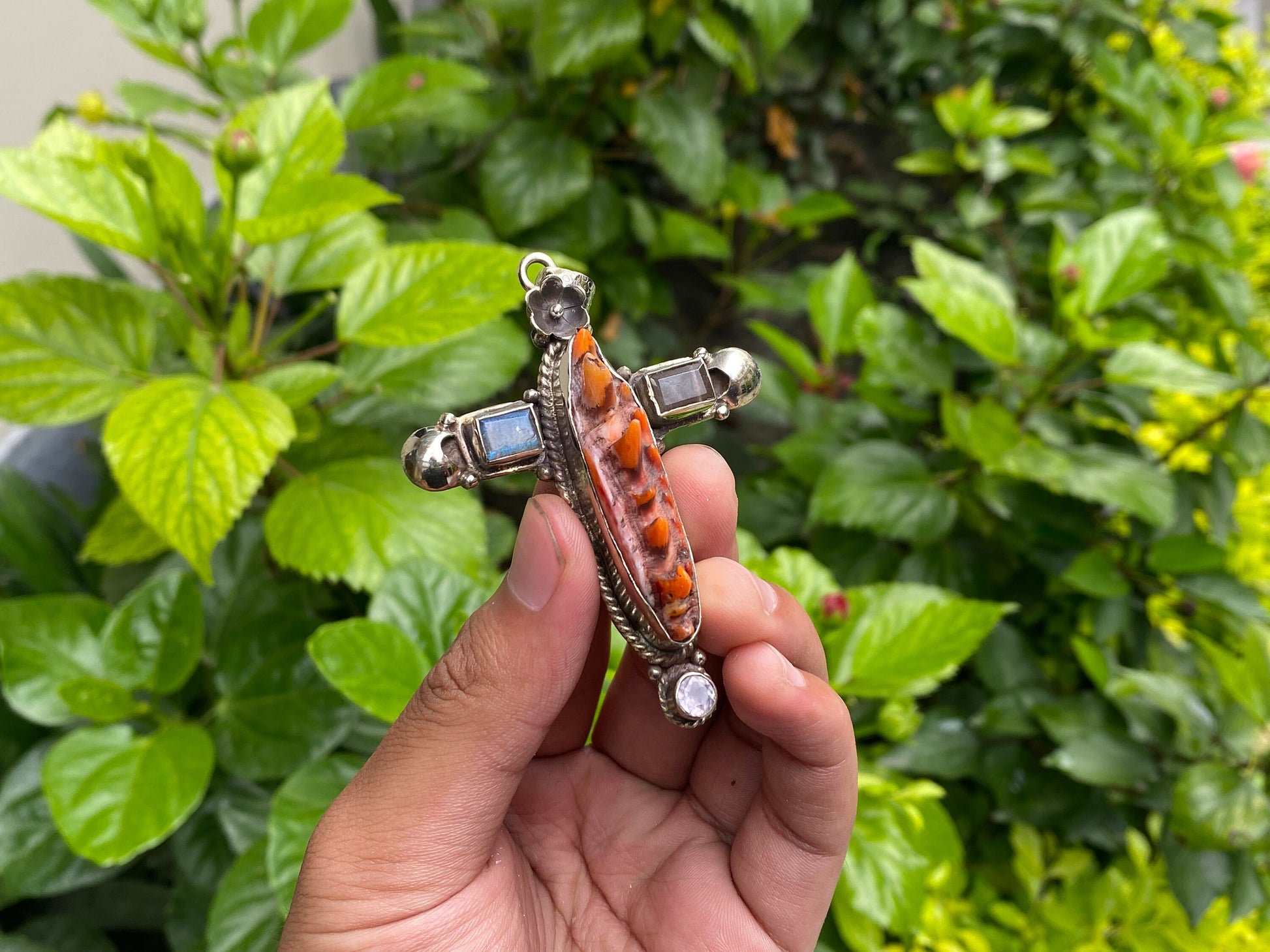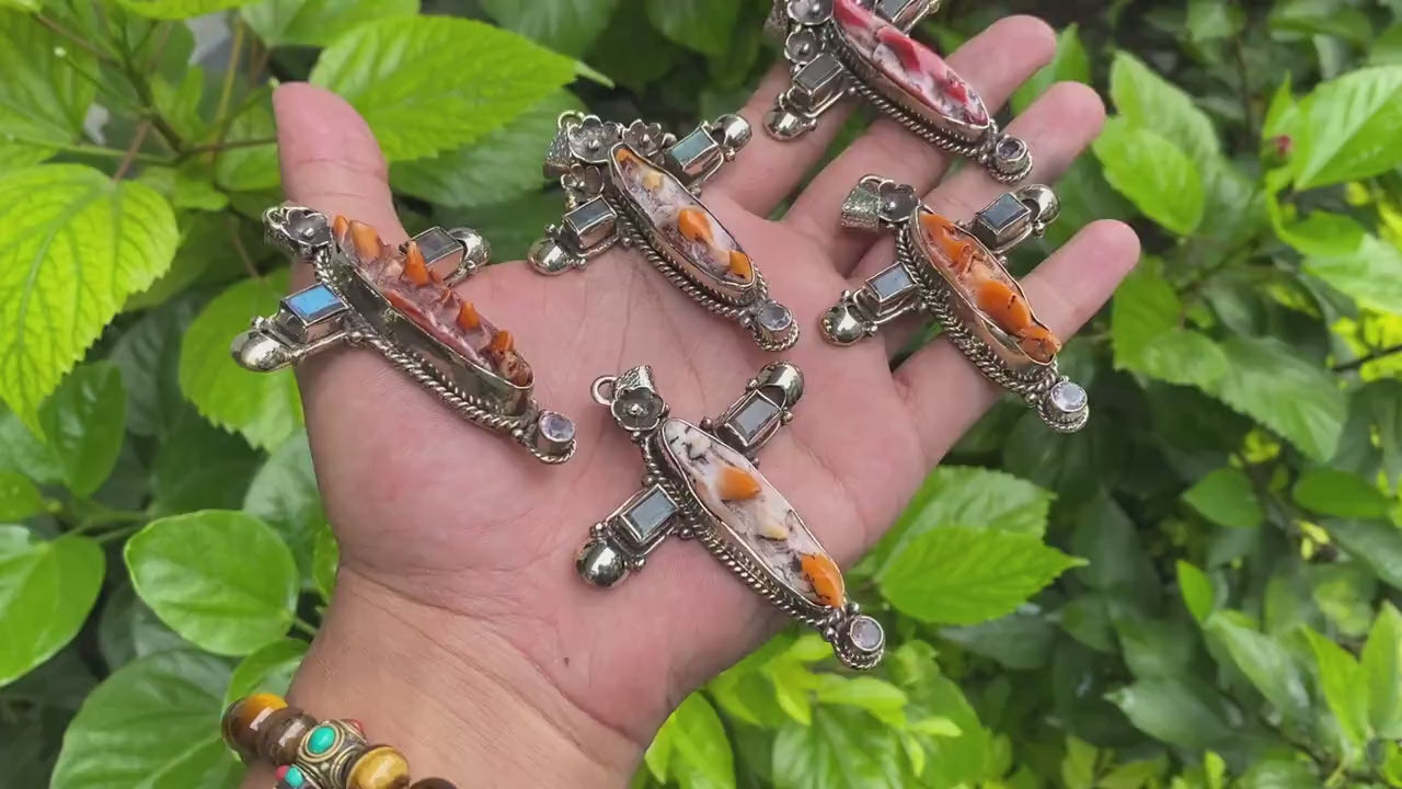 Tibetan Silver Cross Pendant with Spiny Orange Oyster & Natural Gemstones, Hand-carved floral design, Unique wears, Boho Pendant, Gift ideas
