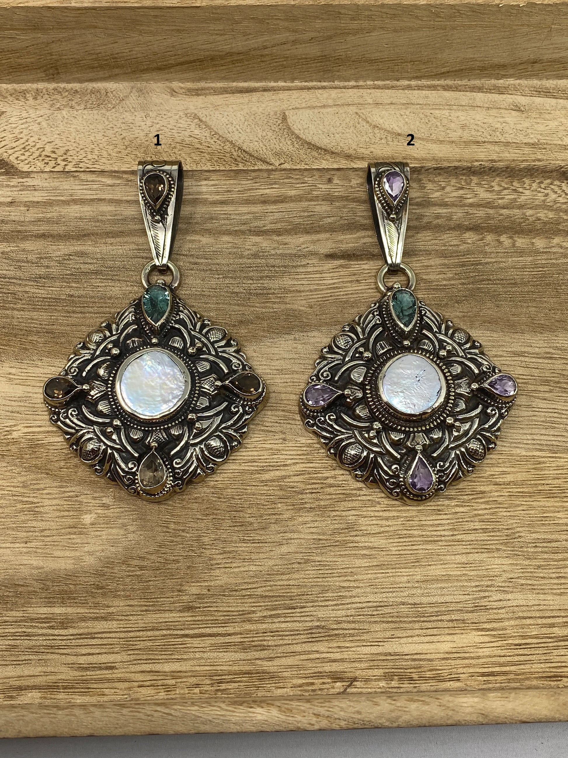 This listing is for 1 piece.At wholesale price!!!This Gorgeous pendant is hand-carved with a remarkable detail. This Tibetan designs pendant is handmade in Nepal and adorned by a beautiful pendant which has a large hole bail that allows you to string it on thicker threads. Perfectly bohemian in style, these tribal beauties come from the Himalayas.Made with Tibetan Silver and Fresh water Pearl Faceted Green Amethyst, Smoky Topaz or Amethyst gemstones pendant beautiful designs. Hand-Carved Flower design on the back side of Pendant. Measurement: approximately Length 105 mm (measuring from bail to bottom), width 60 mm from the widest side, bail size: 10 mm and weighs about 55.2 gm.Beauty of this pendant that is unmatched as they are handmade and are one of a kind. With the nature of them being handmade, each product is unique in its own right and no two products are the exact same. Disclaimer: Items are handmade so please note: Each item is unique may have some small imperfections. There can be a slight difference in actual color than shown in picture.Images may appear enlarged or smaller. Please refer to the measurements given. ✤ Keep in mind:1. Product VarianceAs the jewelry is handmade in nature, the items may experience variance in texture, shape, color, and finish. This also comes with some imperfections, which sets them apart from jewelry made in a factory – that being said please read the description thoroughly and view the pictures before you make your final purchase. As always, please don’t hesitate to ask us if you have any questions as we are more than happy to provide you with utmost quality assurance. 2. Photography & ColorsDue to the fact that we photograph each of our items, some items may seem larger than the actual size and the colors may seem off as well, please make sure to read the dimensions in order to avoid problems that can be easily taken care of. We do our best to photograph the items with as much detail as possible, however, images can deceive the eye, again – feel free to reach us with any questions or concerns!3. LiabilityDiscover Designs Inc. shall not be held responsible for any injuries, damages, or losses resulting from the use of products purchased from our shop. Therefore, by purchasing from our Etsy Store, you the costumer agree that all purchases and uses of products are responsibilities of the buyer. With that said, Discover Designs will not be held responsible for the use, misuse, or mishandling of any items and buyers assume all liabilities for the products they have purchased. The purchase of an item from Discover Designs demonstrates acceptance of this disclosure and releases Discover Designs and its affiliates from liabilities arising thereof. ✪Not a toy, not intended for use by, or in products intended for children 14 or under. May be harmful if swallowed.Thanks for stopping by!