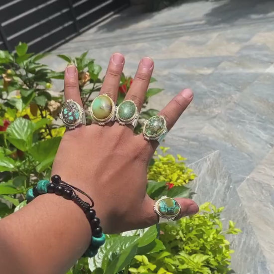 Enjoy the timeless beauty of this natural turquoise ring. Its oval-shaped turquoise centerpiece is elegant and adorned with delicate details. This adjustable, handmade piece has a hammered texture that adds a modern touch to its bohemian look. It's more than just a ring, crafted with...