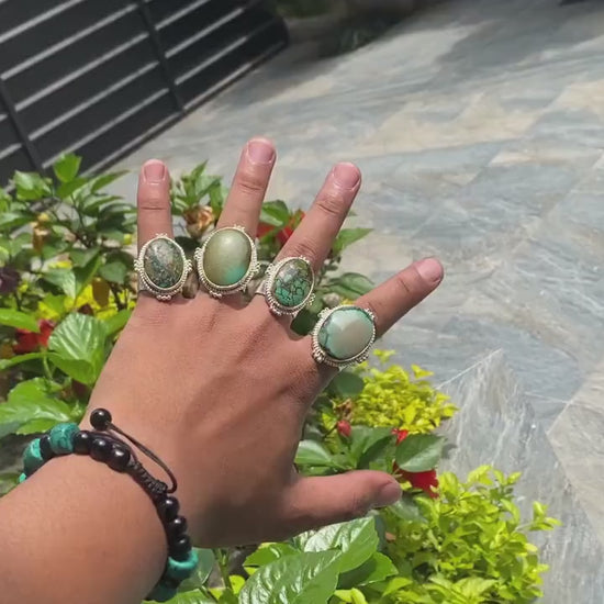 Take in the classic appeal of this genuine turquoise ring. Its oval-shaped turquoise centerpiece emanates elegance, accented by elaborate embellishments. This adjustable, handmade piece has a hammered texture that adds a modern touch to its bohemian style. It's more than a ring, crafted with care in Nepal; it's a sign of style, culture, and handmade craftsmanship, ideal for the modern woman with a diverse taste.