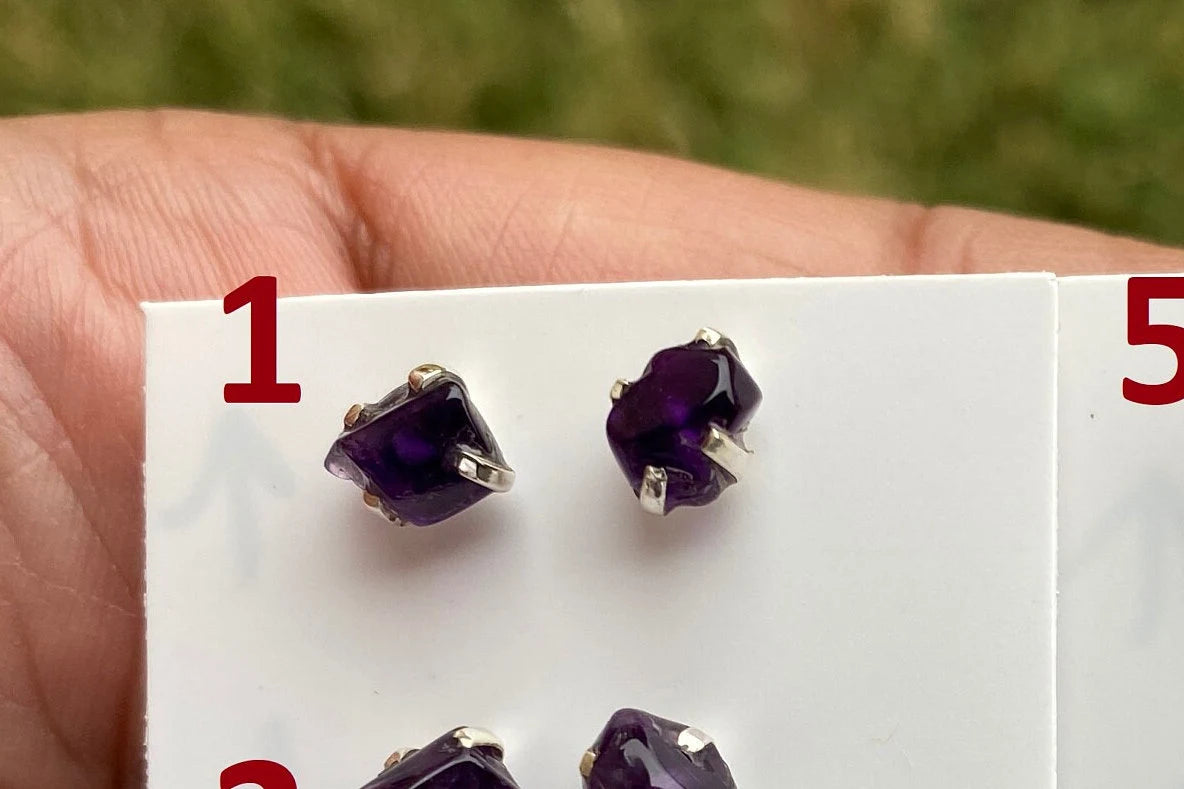 These raw Amethyst gemstone ear studs made with 92.5 Sterling Silver Earring were handcrafted in Nepal. A unique gift for February Birthstone.