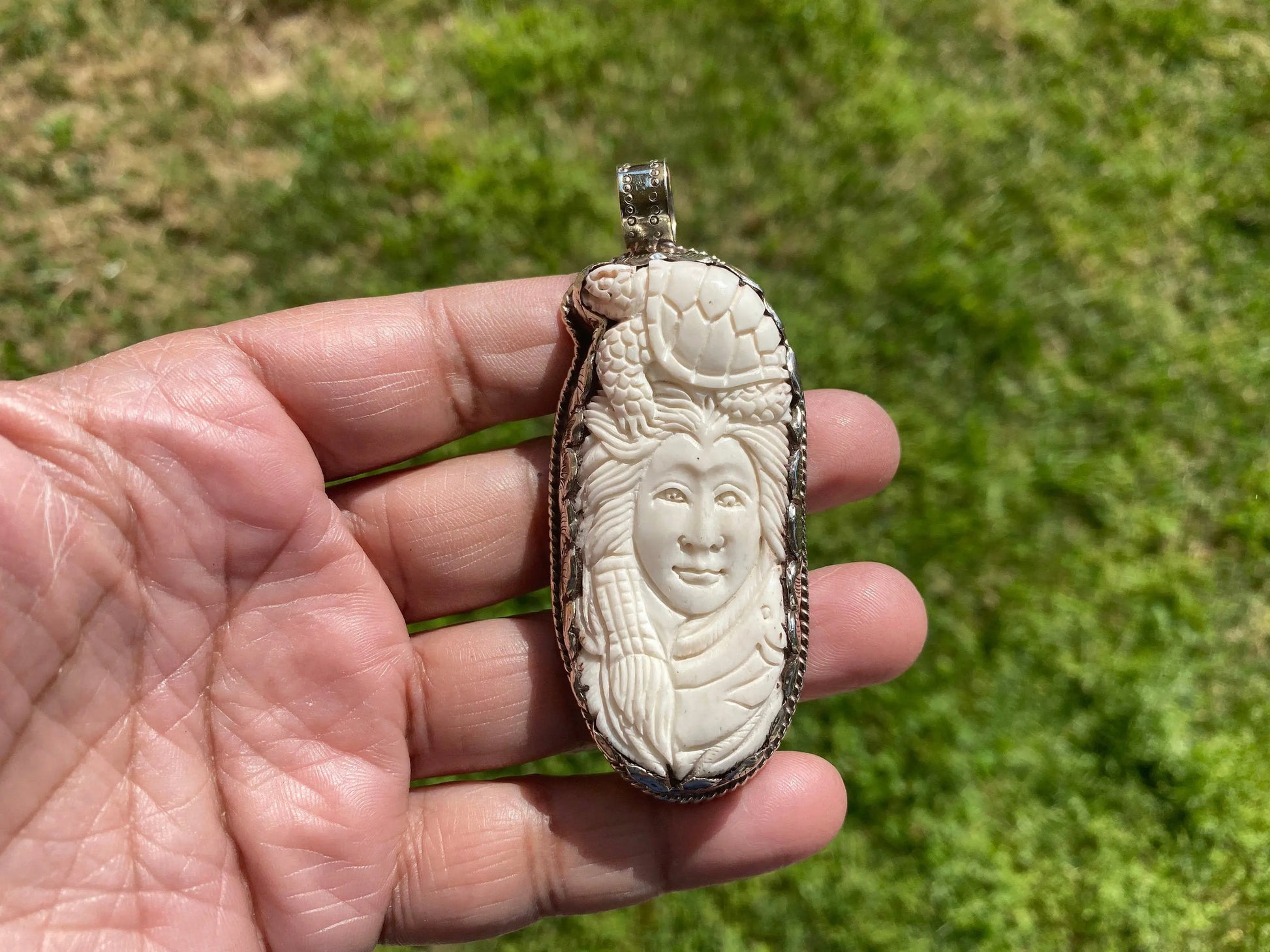 Turtle with Lady Face Carved Buffalo Bone Tibetan Silver Pendant, Men or Women's Jewelry, Tribe Jewelry, Himalayan Jewelry, For Animal Lover