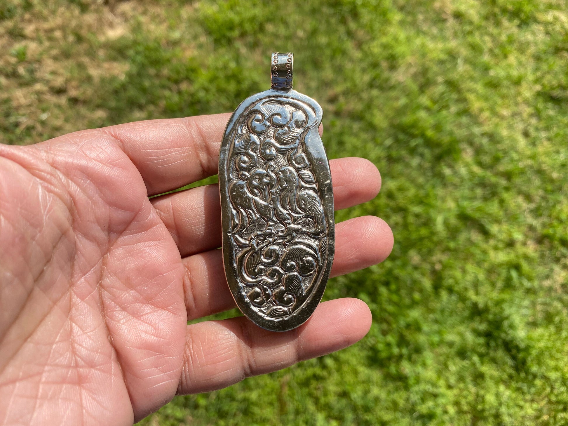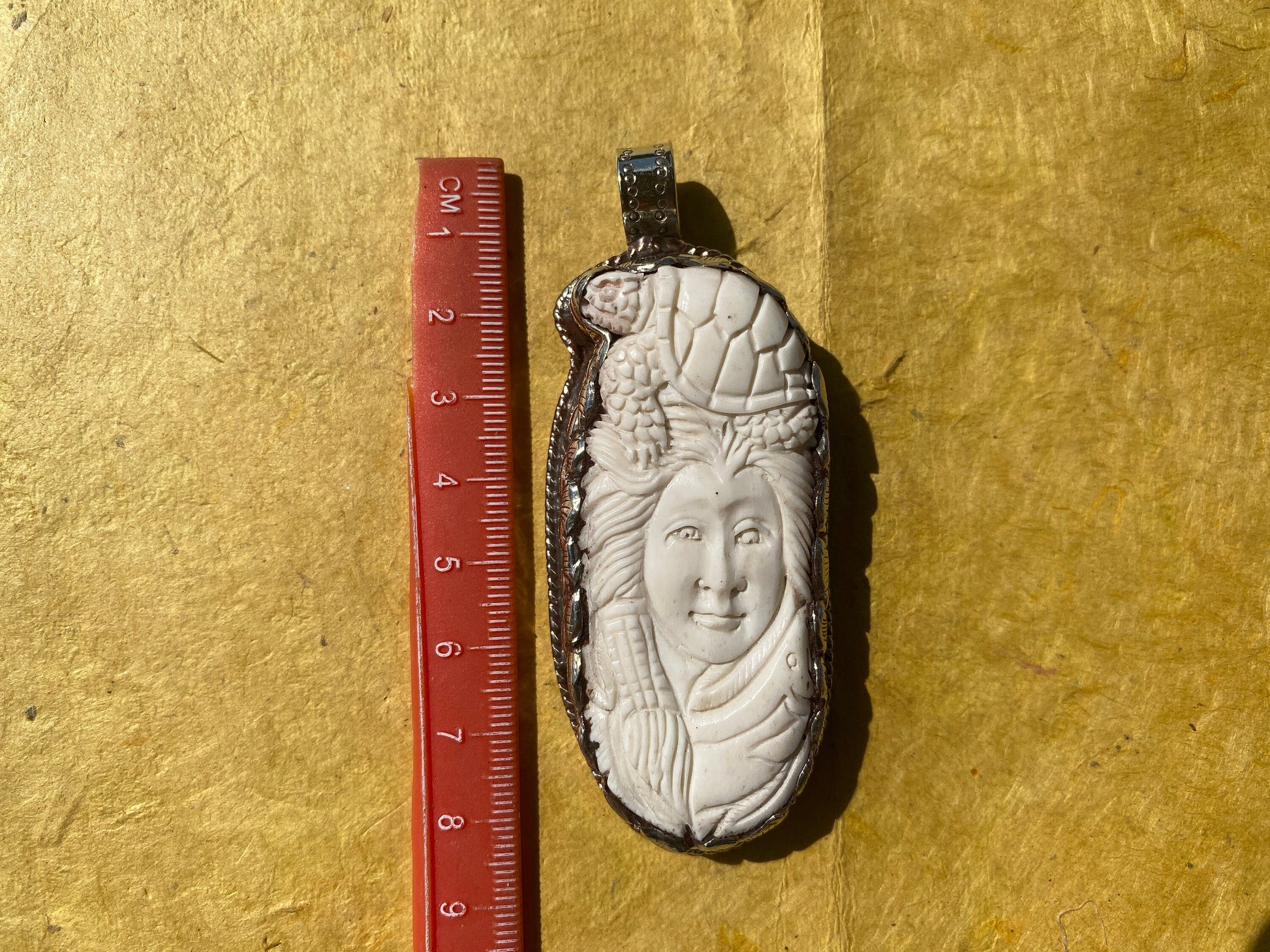 This Gorgeous hand carved buffalo bone pendant made with Tibetan Silver with a remarkable detail of carving. Hand-carved floral design on the back side of Pendant. This Tibetan designs pendant is handmade in Nepal and adorned by a beautiful pendant. Perfectly bohemian in style, these tribal beauties come from the Himalayas. Beauty of this pendant that is unmatched as they are handmade and are one of a kind. With the nature of them being handmade, each product is unique in its own right and no two products are the exact same.