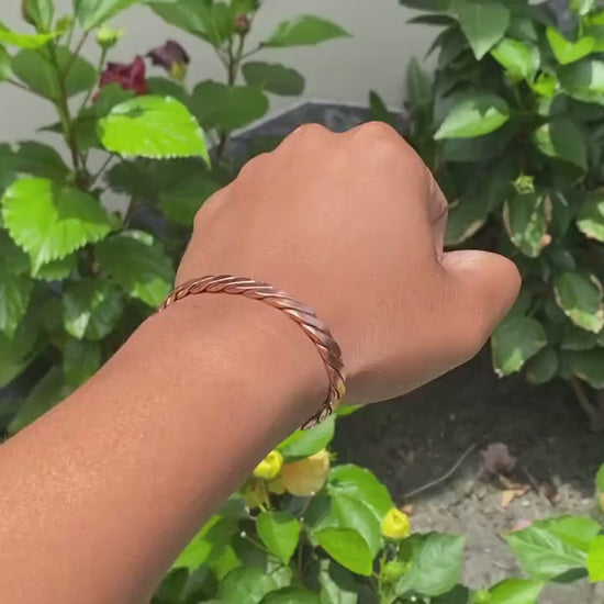 These twisted pure copper bangles are handmade in Nepal, perfect for daily wear. Suitable for both men and women, they combine fashion with healing properties, aiding meditation and inner peace. The hammered design adds a unique touch, making them an ideal gift for any occasion. Embrace traditional craftsmanship and holistic wellness with these versatile bracelets.