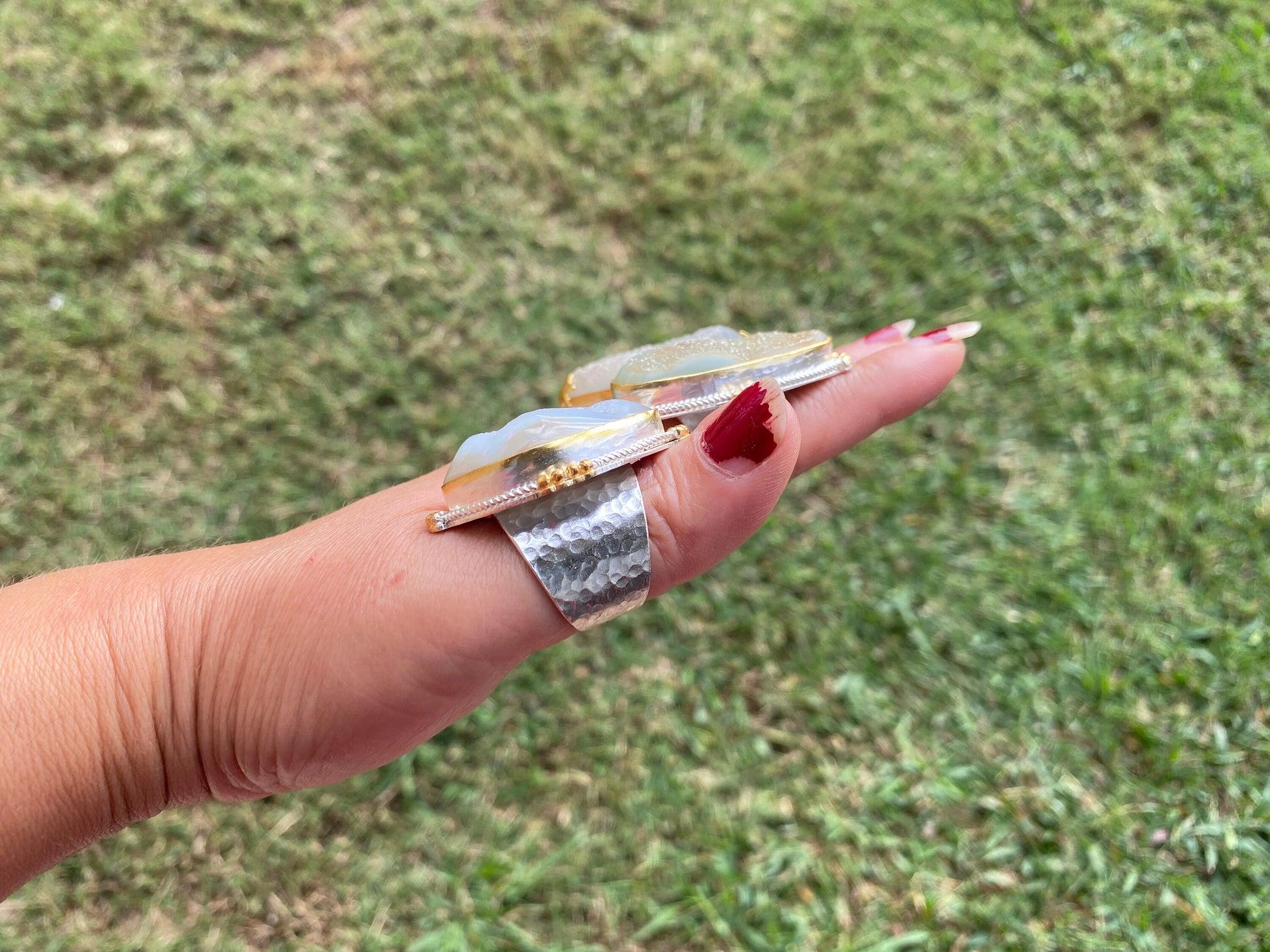 Features:# Natural Drusy gemstones that capture the light from every angle.# Two-tone design offering a blend of colors for a captivating look.# Wide band construction that ensures durability and a contemporary edge.# Adjustable feature to accommodate various finger sizes.# Ideal for gift-giving or a self-indulgent treat.Experience the allure of nature and elegance combined in one exquisite piece.