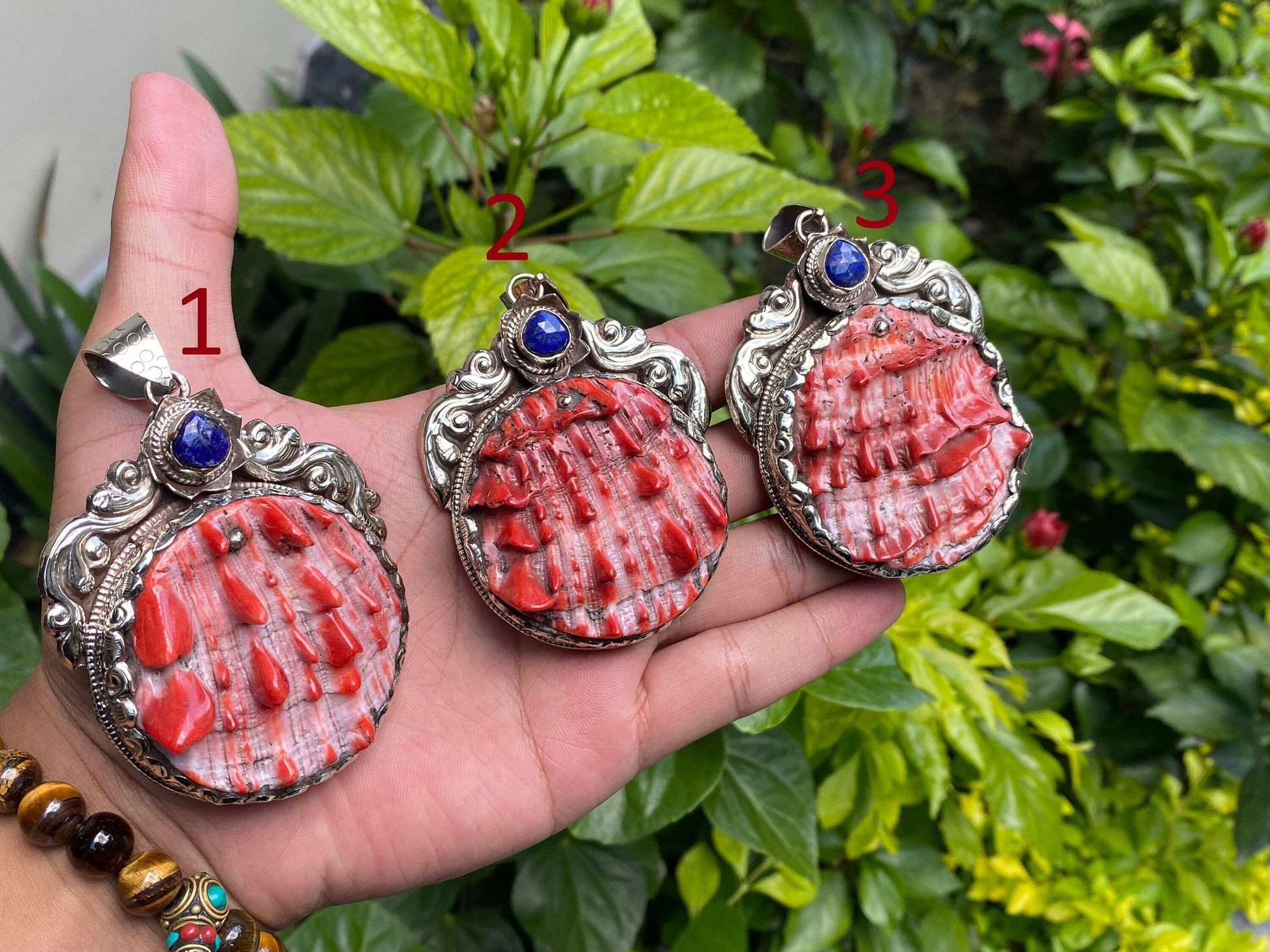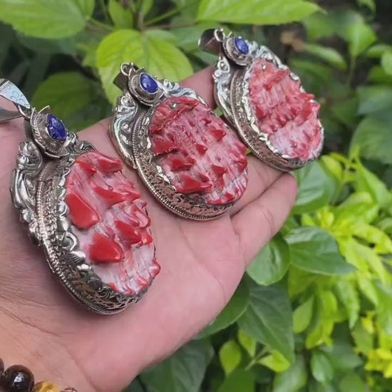 This handcrafted pendant brings together the energizing Spiny Orange Oyster with raw lapis, set in Tibetan silver and finished with a hammered floral design. Crafted in Nepal, it merges oceanic inspiration with artisanal details to bring up a very special gemstone piece, perfect for everyday wear. Its natural elegance and bohemian flair make the pendant a truly unique gift for any jewelry lover.
