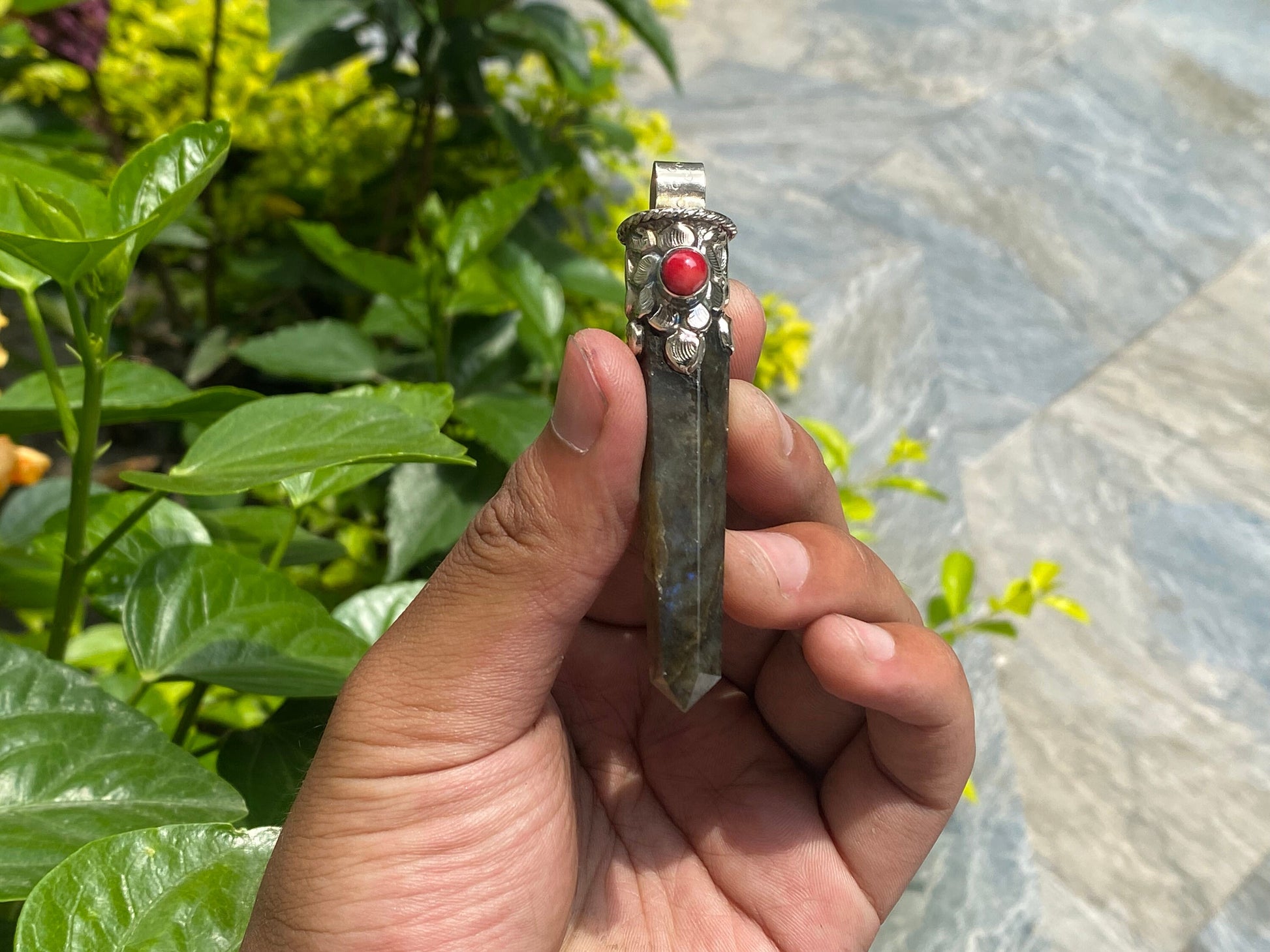 This unisex Labradorite pendant is perfect for daily wear, blending fashion and craftsmanship. Handmade with hammered Tibetan silver, it exudes a rustic charm. The labradorite stone adds a mystical touch, while the coral adornment enhances its elegance. This pendant is a versatile accessory, effortlessly elevating any outfit with its unique, artisanal appeal.