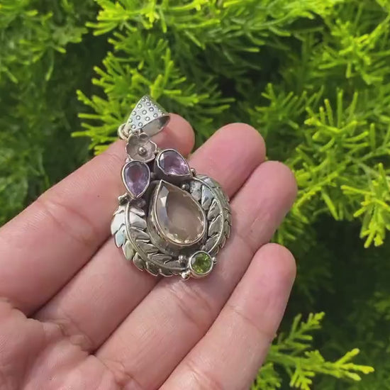 Unique Tibetan silver pendant adorned with Smokey Quartz, Peridot and Amethyst, Handmade floral design, Collectible pendant for daily wear.