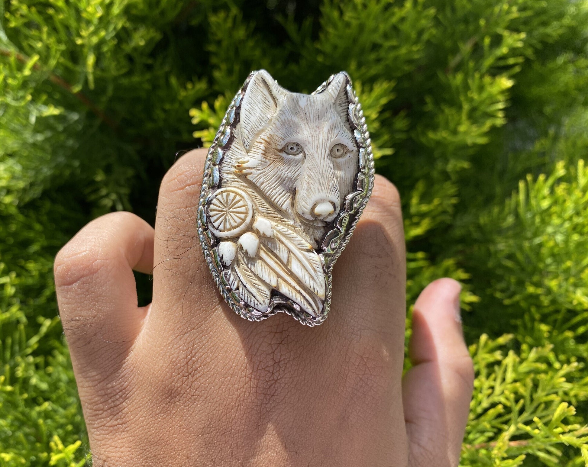 This graceful wolf head ring has been made with great care and dedication by artisans of Kathmandu valley, Nepal. The head of the wolf is carved in buffalo bone and the rest of the parts of ring is made of Tibetan silver giving it a natural looking statement ring. DA 0450This listing is for 1 piece.