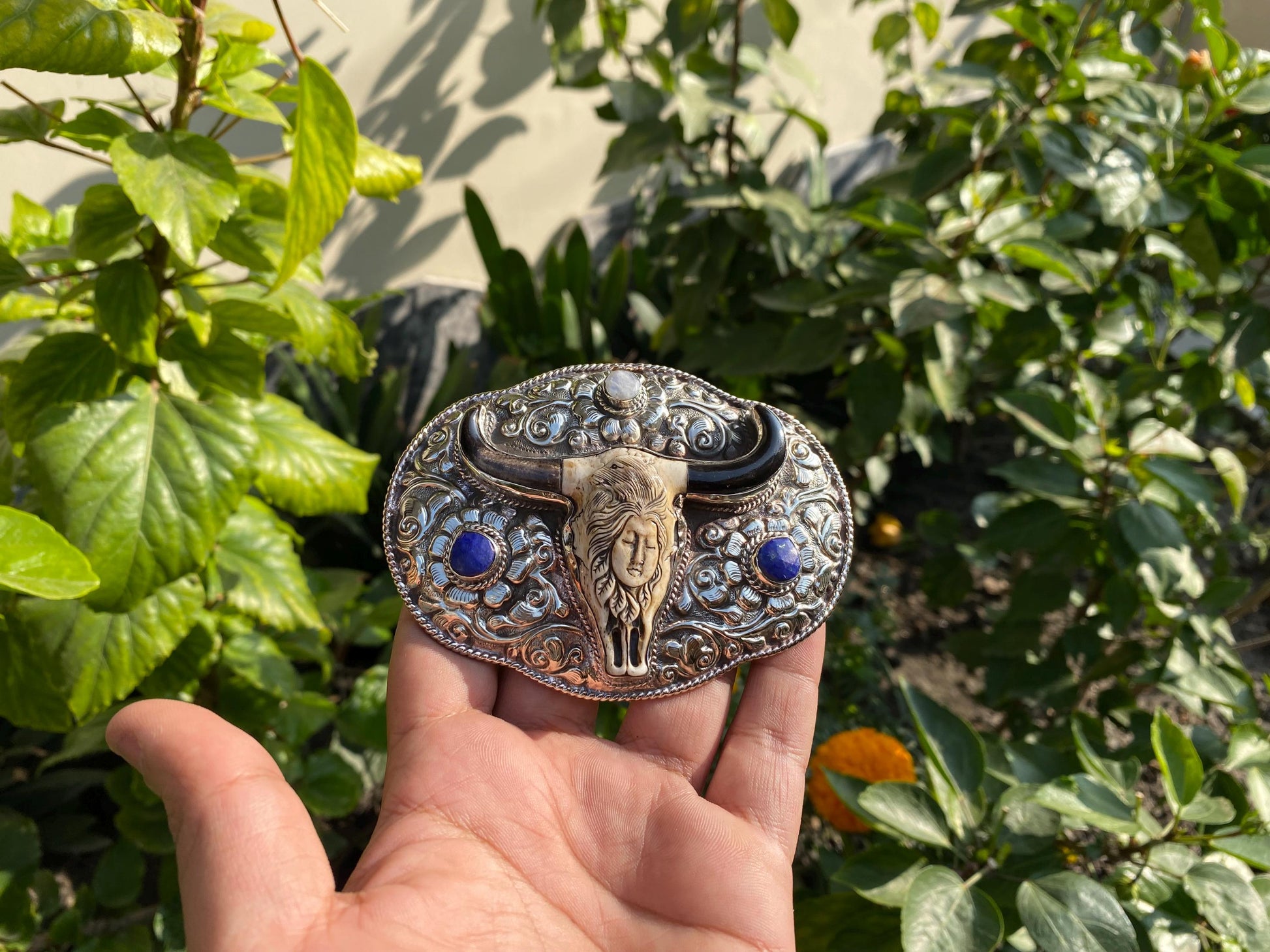 Our handmade in Nepal Belt Buckle inspired by Western style will elevate your everyday look, it is carefully crafted with a large size and exquisite design, such as a buffalo bone with natural moonstone and lapis lazuli highlights or a striking Bull head motif. These buckles, crafted from Tibetan silver and precious jewels, mix rustic appeal with natural elegance, adding a unique touch to every ensemble.