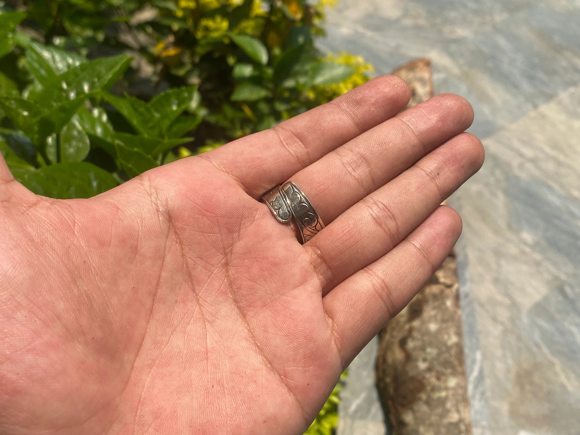 This one-of-a-kind ring has an eye-catching design with a finely carved woman's skull on buffalo bone on a background of Tibetan silver. Its well crafted size adjustment system guarantees a snug fit for all wearers. This striking statement piece gains depth and personality from the...
