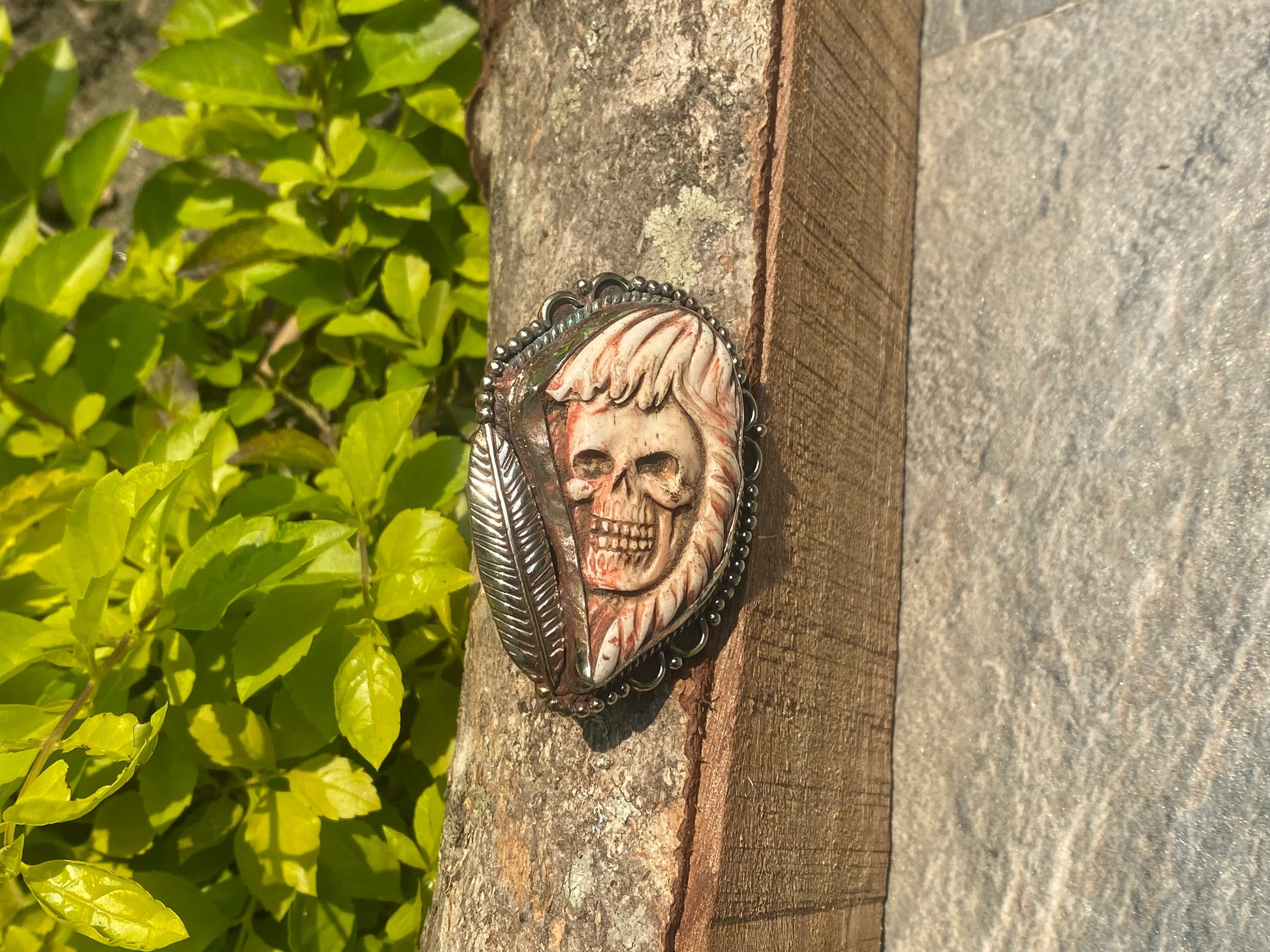 This one-of-a-kind ring has an eye-catching design with a finely carved woman's skull on buffalo bone on a background of Tibetan silver. Its well crafted size adjustment system guarantees a snug fit for all wearers. This striking statement piece gains depth and personality from the hammered texture, which makes it an alluring addition to any jewelry collection.